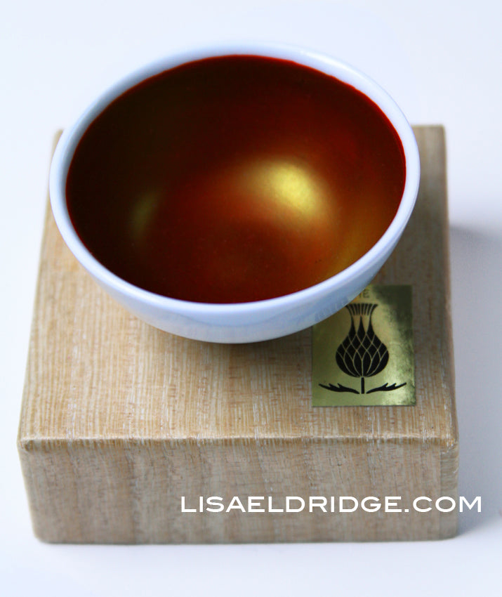 On one such visit I asked to buy something that would make a perfect Geisha or Kabuki red lip and was presented with a little ceramic dish (see picture). To the naked eye the powder looks gold (it has photographed much more red than it looks). I was confused and thought he had given me an empty mixing bowl, albeit a very pretty gold one.